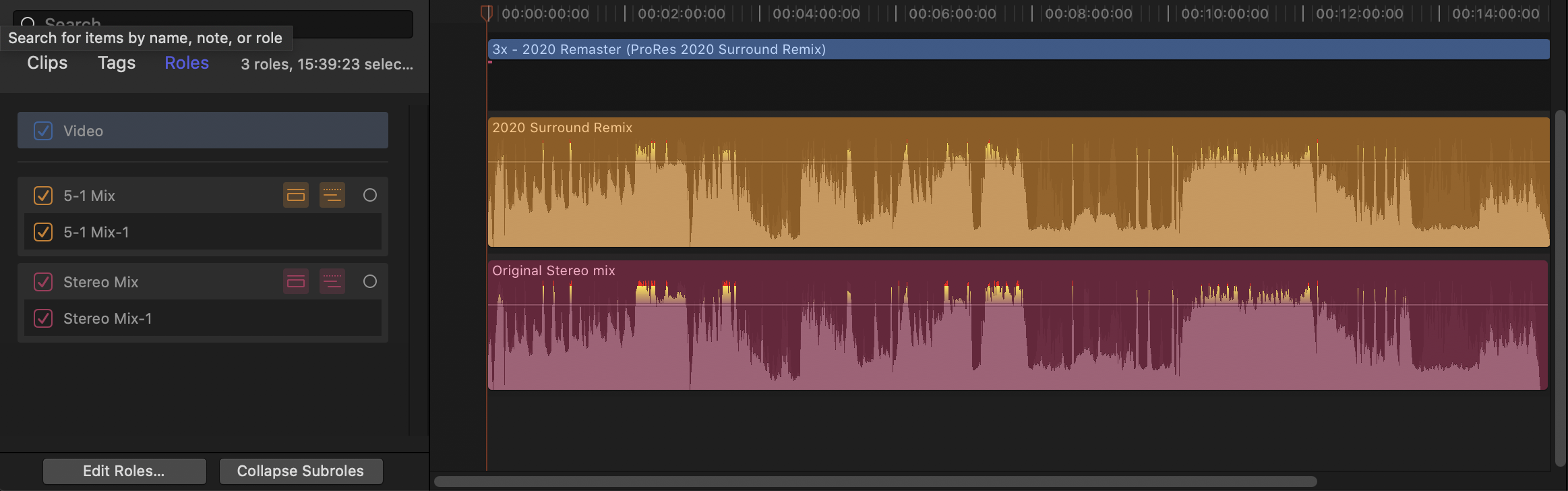 If you’ve done everything correctly you should end up with a ProRes master file that includes 1 audio track featuring your surround mix, and 1 audio track featuring your stereo mix. You could, in theory, create even more audio tracks (say for alternate languages) in the same way. Just create more roles, and assign accordingly.